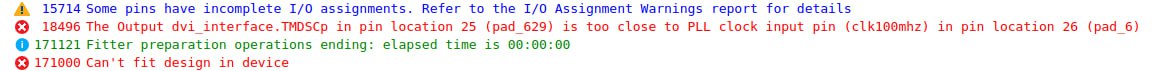 And yeah, it unexpectedly turned out that the JTAG programmer was physically blocking the HDMI port. I couldn’t have both plugged in at the same time. This turned the debugging process into a tedious ritual: plug in the programmer, flash the internal memory with a new design, unplug the programmer, plug in the HDMI cable, power it up via USB, and wait to see… “No Signal” again.