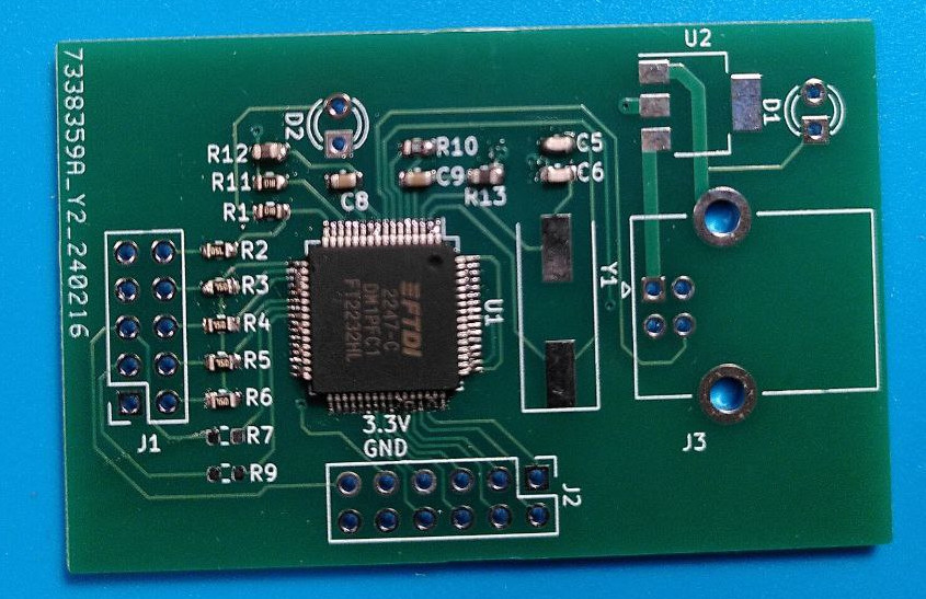 - JTAG programmer was built on a separate PCB based on a known working schematic of mbftdi. This minimized the risk of a design error and gave me a chance to practice my soldering on a simpler device before touching the main board.