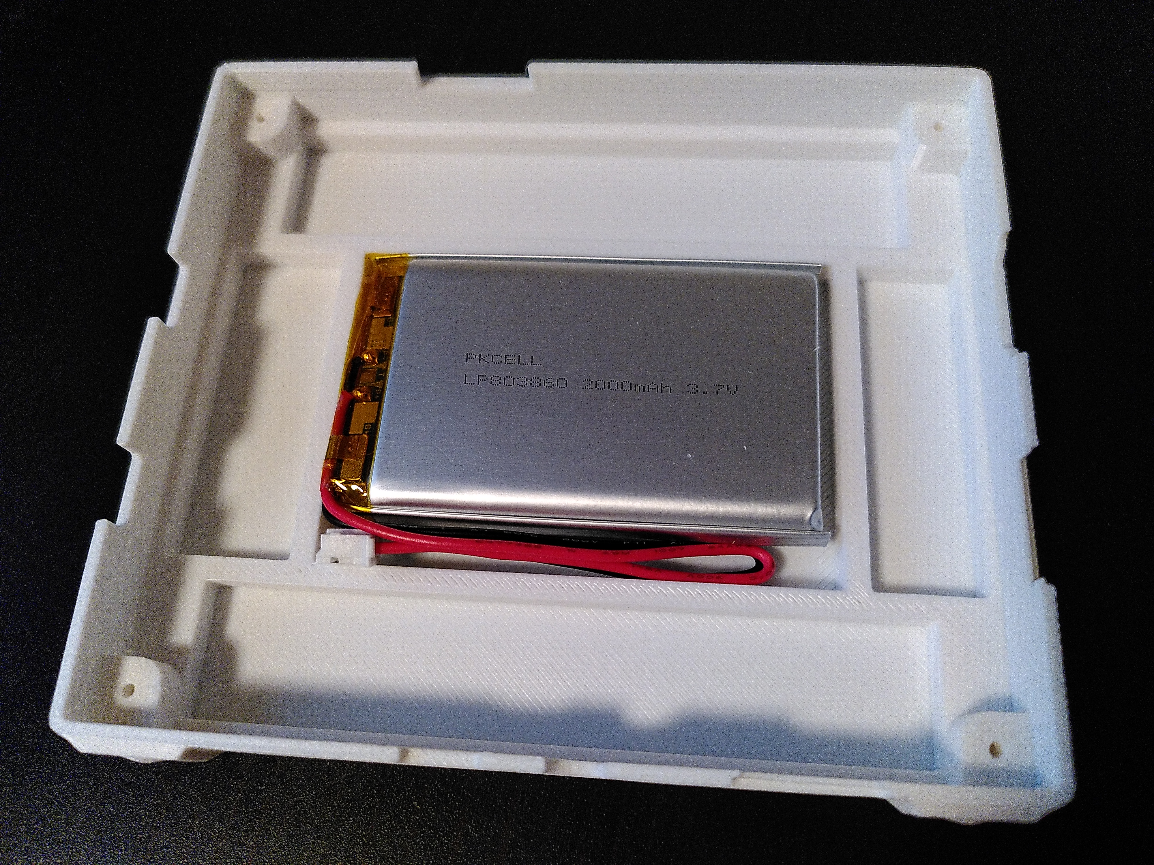 The bottom part has a battery pocket and mounting tabs for the PCB.