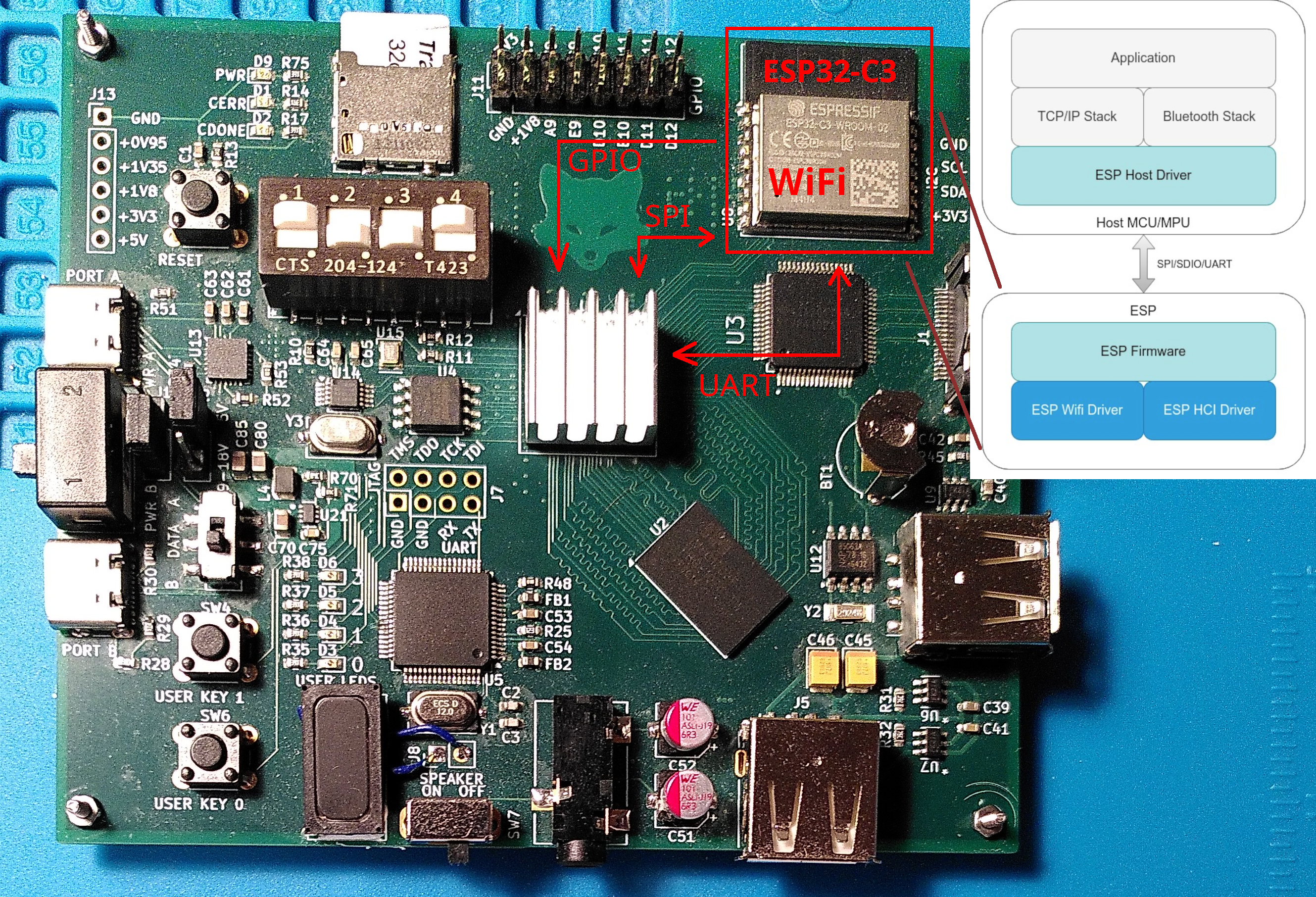 When designing the board I only briefly read about ESP-Hosted. There were other things to worry about — BGA soldering, DDR3 routing, and so on. For the first revision Wi-Fi was considered an optional feature — great if it works, but not a critical problem if it doesn’t. So I just added the ESP32-C3 module and routed the pins required for UART and SPI. UART — for writing firmware and as a debug interface; SPI – because ESP-Hosted-NG needs it for Wi-Fi.