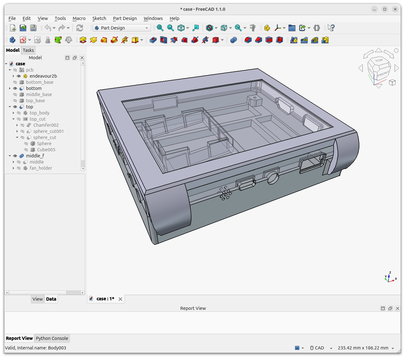 After the first unsuccessful attempt to attach the screen to the upper part of the case with duct tape (actually my first experience with 3D printing), I came up to assembling it of three parts.